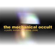 THE MECHANICAL OCCULT (2006). Art was originally an evoker of the dead, a rescuer of the dead (and the living) through mediumistic contact… a shuttle craft across the last abyss … a rattle shaken over a decomposing body … a vision pursued through an induced psychotropic haze or abject bodily exhaustion, then revivification with true hallucinations.Does art still have a psychopompic role to play or has the very speed of transmission / storage precluded even that minimal protestant state? We desire art to come out from some essential place and so art has always gravitated, in one way or another, and before the current era of anti-gravity contraptions which promise to levitate us beyond the ?essential? to the MOST essential, toward the negative … that is, death.The supplement, the prosthesis, now speaks to us of non-orders of being, paratactic arrangements of existence that preclude living/dead — truly a levitation beyond all groundings. This is not a regime of Truth much less ?facticity? … actually … it is a regime perhaps more akin to the simultaneous realm of ?is / is not? that Schrodinger?s quantum cat lives/does not live out unseen in its unopened box …